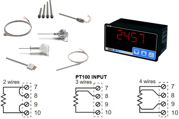 Theo sơ đồ đấu nối trên bộ hiển thị ta đấu 2 dây cùng màu của pt100 lần lượt vào chân 7 và chân 8. Dây khác màu còn lại đấu vào chân số 10